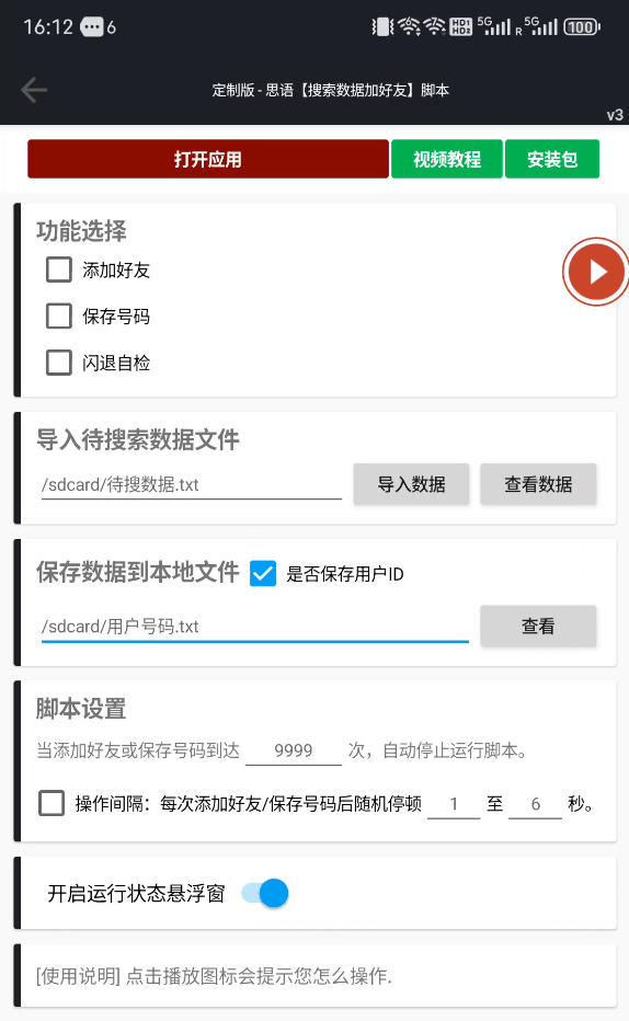 - 脚本就是通过安装手机APP应用,在相应的应用里给里面的人发广告,通过发消息,将人到我们的微信或QQ当中。 现在QQ或微信加人限制越来越大,封号几率成倍增加。现在通过脚本,来实现被动加人,就降低了封号风险。 脚本设置非常简单,利用平台APP内的私信和关注等功能自动化操作,发消息给APP内的用户,通过话术到自己的QQ或微信里,实现了被动加人。 有人问,用脚本一天能加到多少人?我只能说你干的多,就的多。举个例子,开一个模拟器运行一天脚本如引到50+人,那么多开模拟器去操作,就可以相当可观的人数。